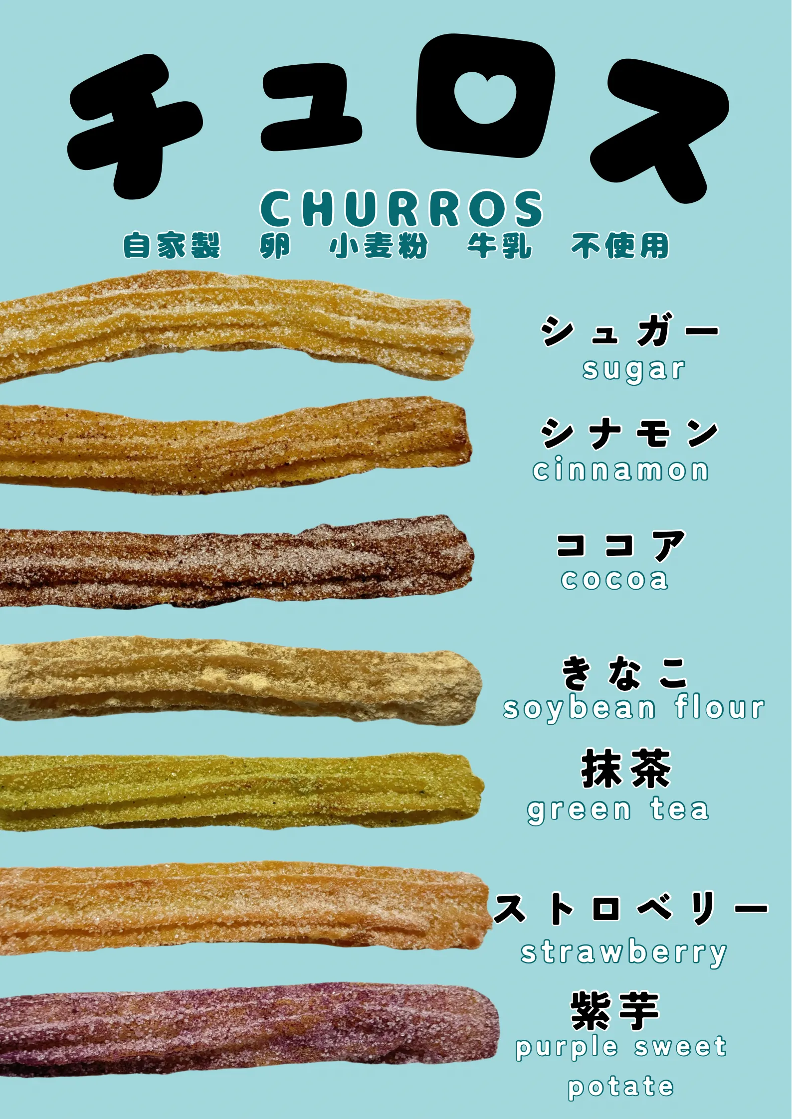 - 自家製生地のチュロス! 卵 小麦粉 牛乳不使用の食品添加物無添加の生地。 一味違うチュロスをぜひお試しください。