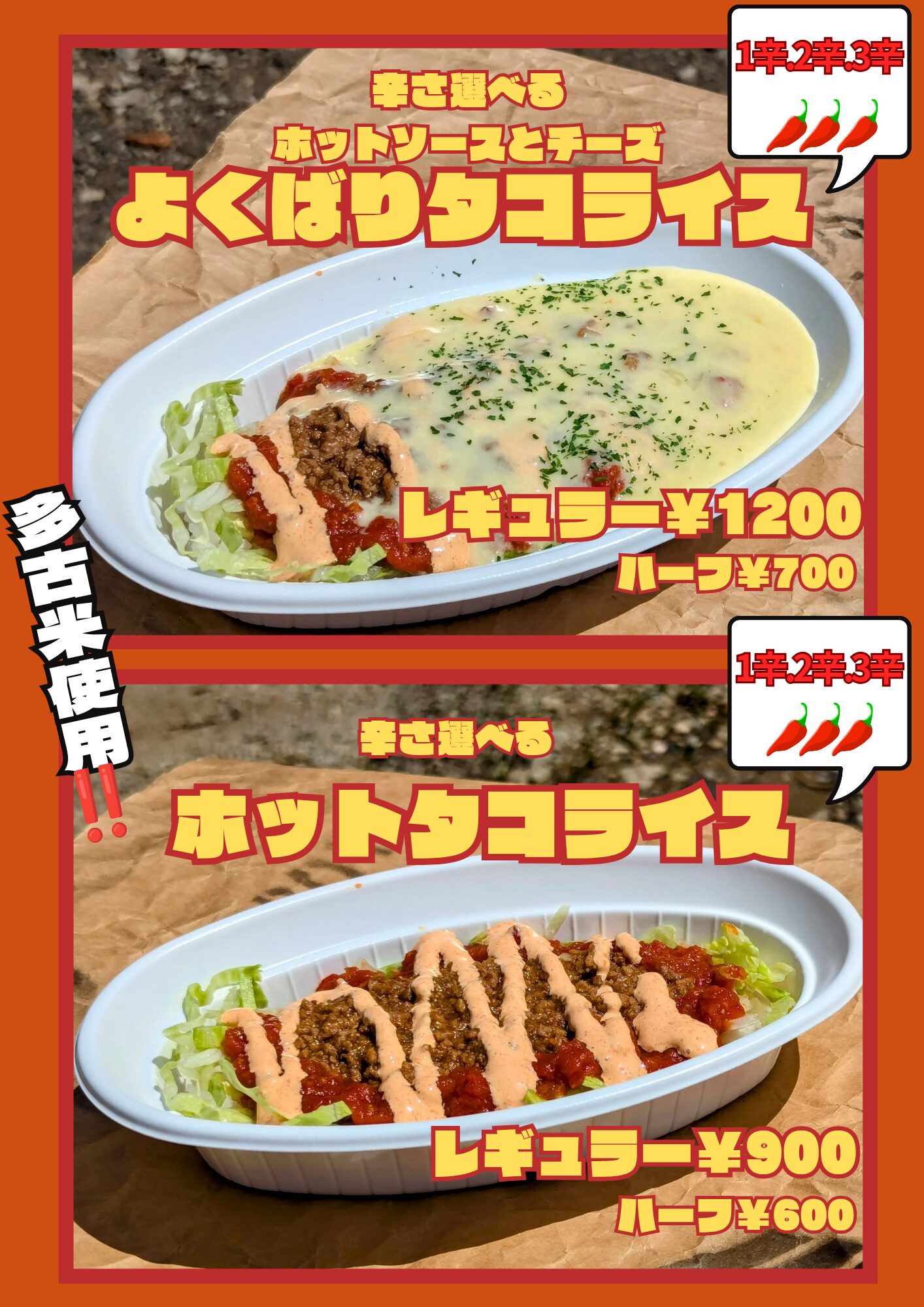 - 希少な多古米を使用した絶品タコライス!激辛Hotタコライスやたっぷりチーズタコライス、お子様にも召し上がっていただけるオリジナルタコライスなど!フリフリポテトや揚げたこ焼きも人気です!