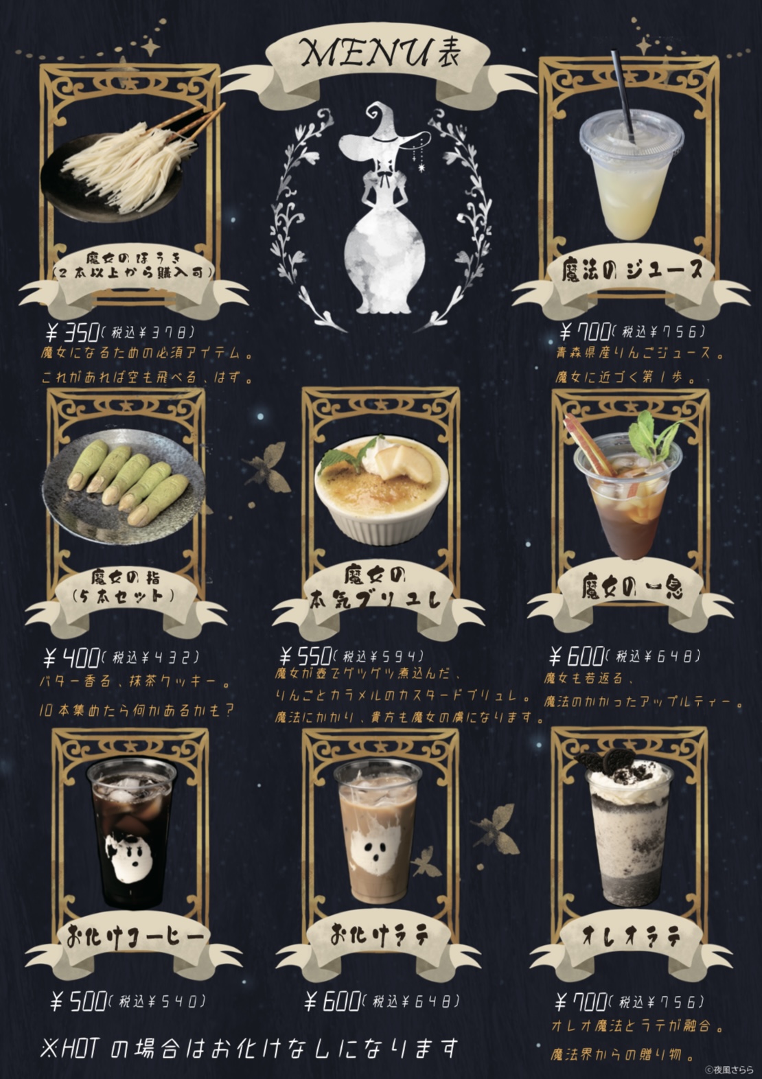その他、魔女に準えたサイドメニューやドリンクが数種類 400円〜700円前後