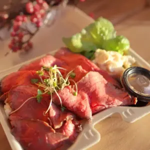- 低温調理で作ったしっとり柔らかなローストビーフです。 自家製のソースと一緒にお召し上がりください!