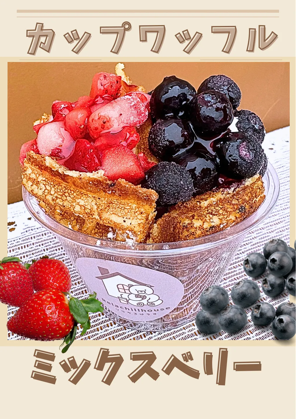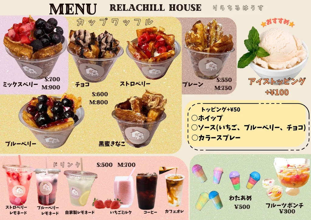 - 米粉、米油を使用したサクフワ食感が美味しいワッフルです。ホイップ、ソース、果物等トッピングして、お好みのカップワッフルをお召し上がりいただけます。 レモネード、コーヒー等ワッフルに合うドリンクも用意しています。