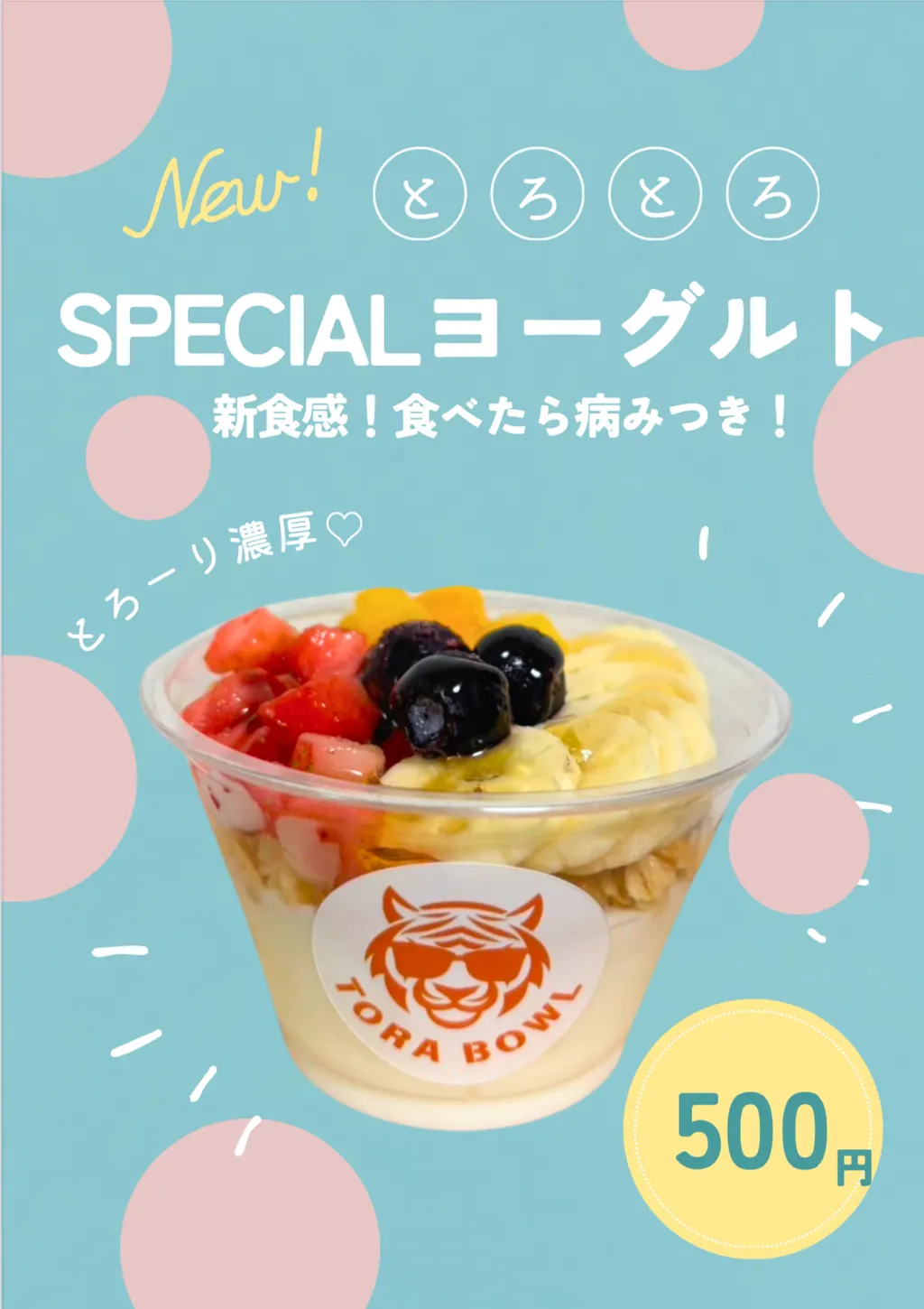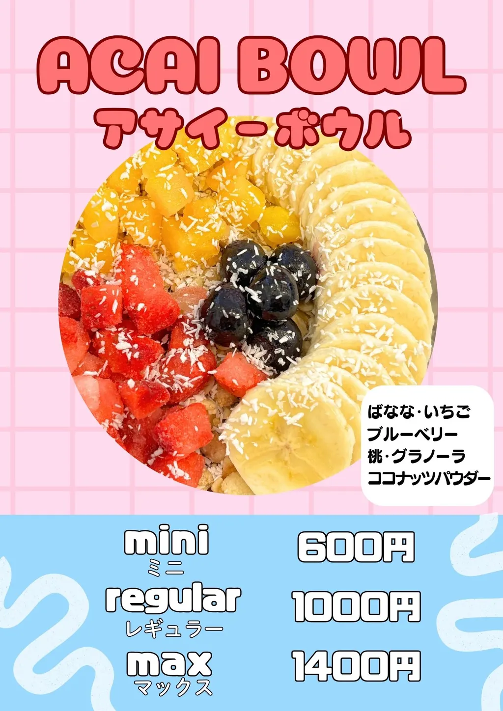 - こんにちは! いま大人気のスーパーフード【アサイーボウル】を提供しているTORABOWLです! アサイーボウル(ミニ600円〜)の他にもぺったんこチョコクロアイスやプレミアムヨーグルト・くりーむ大学芋等、老若男女どなた様にも喜んで頂ける美味しいスイーツや、日替わりでロコモコ丼やハワイアンバーガーをご用意して伺わせて頂きます。 皆様に笑顔をお届けに参りたいです。 是非よろしくお願い致します!
